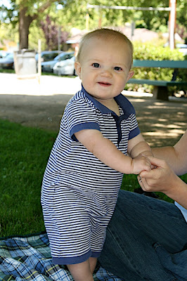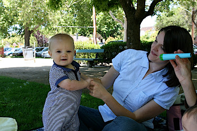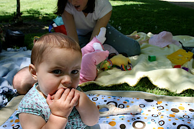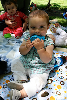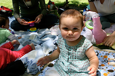 /This afternoon we met a bunch of moms at a park in Palo Alto to play. It is a group who used to met at Cafe Baronne's on Thursday for "Blanket Babies" with pre-crawlers. We graduated to the park where they can be a little more active and cause some trouble. We saw some of our old friends and met some new ones. Melanie and Noah (Francie's FIRST playdate:) from our Bradley Childbirth class were there and we hadn't seen them since the babies were brand new so it was fun to see how big Noah is now. The weather even cooperated today, but it is supposed to get a little cooler this weekend. Where is the hot summer bubble suit weather?! Francie has some clothes to get at least one wear out of before she grows out of them ;)