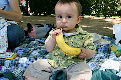 Elijah in a banana shirt chowing on a banana