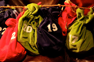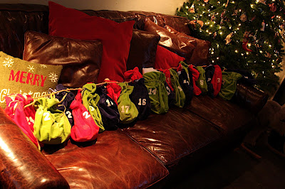 When we were little we had a swiss au-pair, Moni, who made us each a little advent calendar to hang from our doorways with a wrapped little toy or candy to open each day. We've carried on the tradition and usually make a version of the calendar for someone we know every year. I made this "re-usable" calendar with little santa bags a few years ago for my nieces Ellie and Kate, they brought it back for Francie this year. I was a little delayed getting it filled but we're counting down the last "12 Days of Christmas" :)