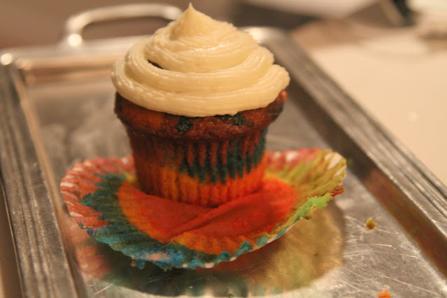 It was kind of cool to see that we added a glob of pink on the very top of the batter in the muffin tin and when they baked the sides came up around the top and the pink ended up in the middle. I'm a nerd.